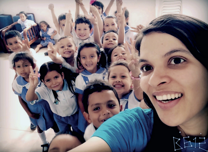 La hermana Caress Prado entre los niños durante una clase de música en la escuela; una foto del archivo personal de la hermana Caress Prado.