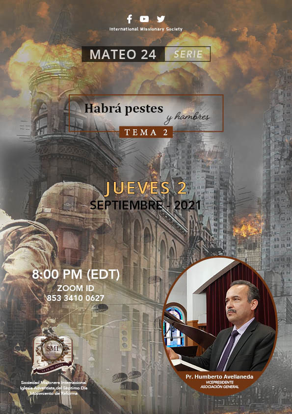 Mateo 24, Tema 2 Jueves 2 de septiembre de 2021 a las 08:00 pm (EDT). Zoom: 853 3410 0627. "Habrá pestes y hambres" Por Michael M.|2021-08-31T21:54:41-04:00agosto 31st, 2021|Noticias SMI|Sin comentarios Share This Story, Choose Your Platform! FacebookXRedditLinkedInWhatsAppTumblrPinterestVkCorreo electrónico Artículos relacionados