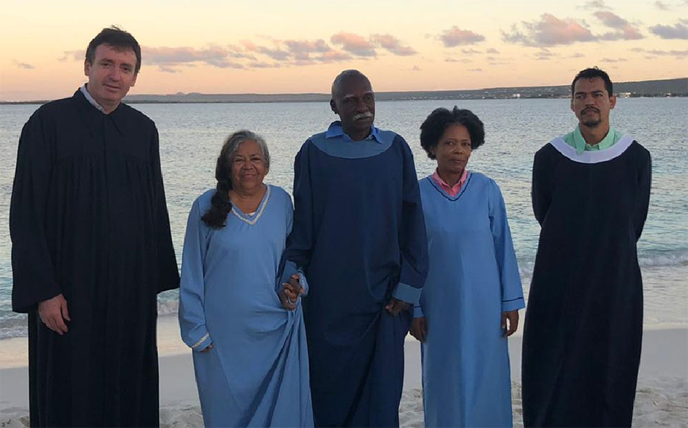 Pastor Pablo Hunger, así como las tres almas que son listas a ser bautizadas junto con el Pastor local exactamente antes del bautismo en Bonaire; Foto del Campo de Bonaire.
