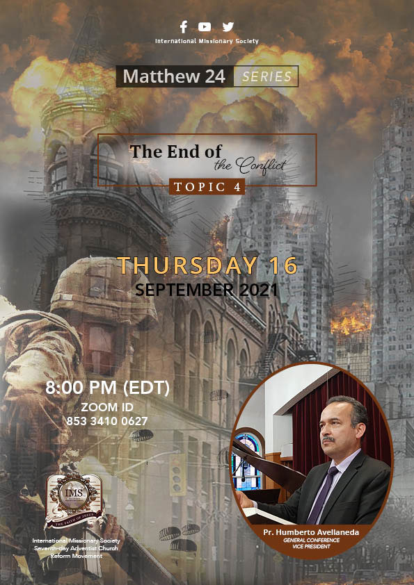 Matthew 24, Topic 4 Thursday, September 16, 2021 at 08:00 pm (EDT). Zoom: 853 3410 0627. "The End of the Conflict" By Michael M.|2021-09-16T14:34:11-04:00September 16th, 2021|IMS News|0 Comments Share This Story, Choose Your Platform! FacebookXRedditLinkedInWhatsAppTumblrPinterestVkEmail Related Posts
