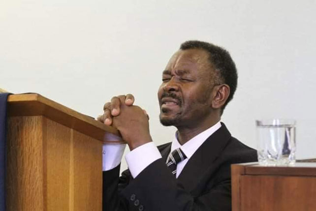Pastor Parmenas Nicodemo Shirima in prayer in the pulpit just before the sermon;