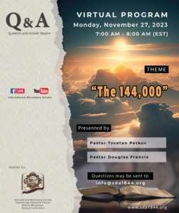 Q&A Session – The 144,000 Virtual Program – Monday, November 27, 2023 By Omar M.|2023-11-26T23:50:53-05:00November 26th, 2023|IMS News, Q&As|0 Comments Share This Story, Choose Your Platform! FacebookXRedditLinkedInWhatsAppTumblrPinterestVkEmail Related Posts