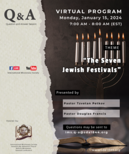 Q&A Session – The Seven Jewish Festivals Virtual Program – Monday, January 15, 2024 By Omar M.|2024-01-14T20:37:24-05:00January 14th, 2024|IMS News, Q&As|0 Comments Share This Story, Choose Your Platform! FacebookXRedditLinkedInWhatsAppTumblrPinterestVkEmail Related Posts