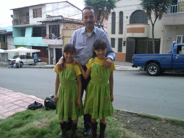 Pastor Humberto Avellaneda with two twin girls in Medellin, Colombia, in July 2013;